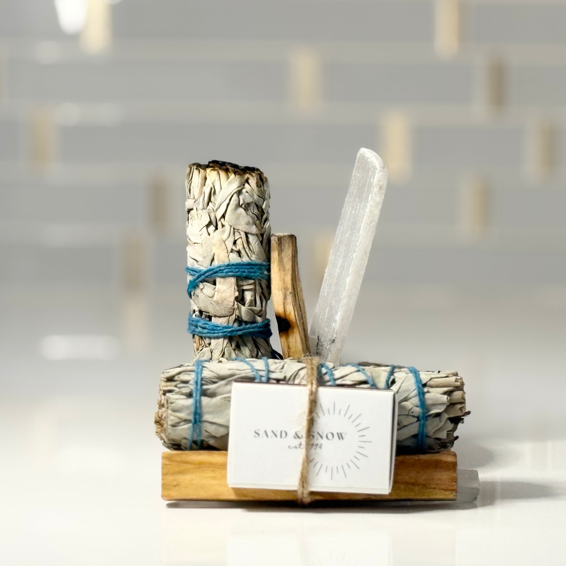 Step into sacred simplicity with The Ritual Kit — a curated collection designed to help you reset your energy and realign your space. Inside you’ll find a sage bundle, Palo Santo stick, selenite crystal, and a box of wooden matches — each element chosen to bring balance, clarity, and grounding to your daily rituals.